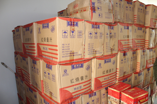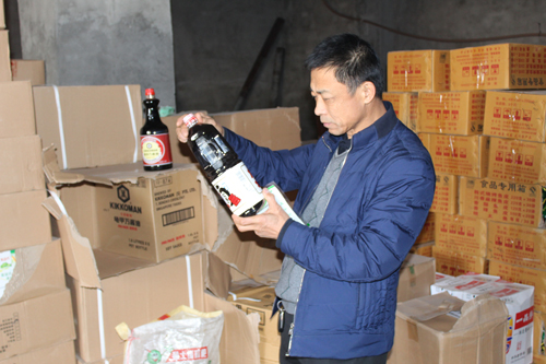 为了避免假冒调味品流入到老百姓的餐桌上,稽查局联合经侦支队执法人员对赵广海的哈尔滨市下线客户进行了突击清查,分别在香坊区横道市场和哈安大市场的两个调料品商行查扣假冒东古酱油72桶、太太乐鸡精7袋、太太乐鲜味宝调味料13袋、李锦记蒜蓉辣椒酱8瓶。