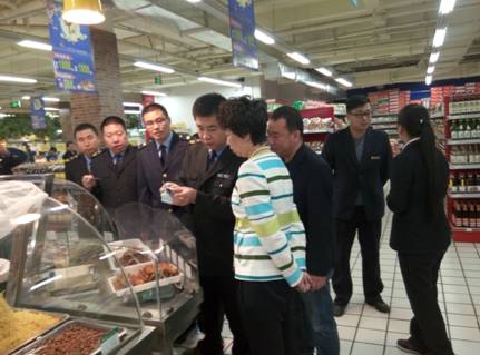 中秋将至,友好分局在副区长王蘶带领下,联合区工商局、区质监局、区卫生局等部门对全区中秋节前食品安全工作展开联合检查,区电视台进行了跟踪报道。 联合检查组一行深入到友好大商超市、高源超市及节日食品加工小作坊,针对食品生产经营企业台帐建立及索证索票情况、隐患排查治理情况及应急工作等进行了详细的询问和督查检查。详细了解商品的进货渠道、食品质量和销售情况,查看进货凭证、经营许可证、卫生许可证等材料及证件。 王巍副区长强调,各职能部门要密切配合、认真履职,切实加强节日期间食品安全监管力度,强化业主食品安全意识、规范经营行为,坚决打击变相提价等违法行为,加强应急值守,切实维护广大消费者和经营者的合法权益,严防食物中毒事故发生,全面确保人民群众在节日期间消费安全。同时叮嘱相关责任人一定要把好食品安全关口,守信食品安全这条底线,确保群众在中秋佳节吃上放心食品。
