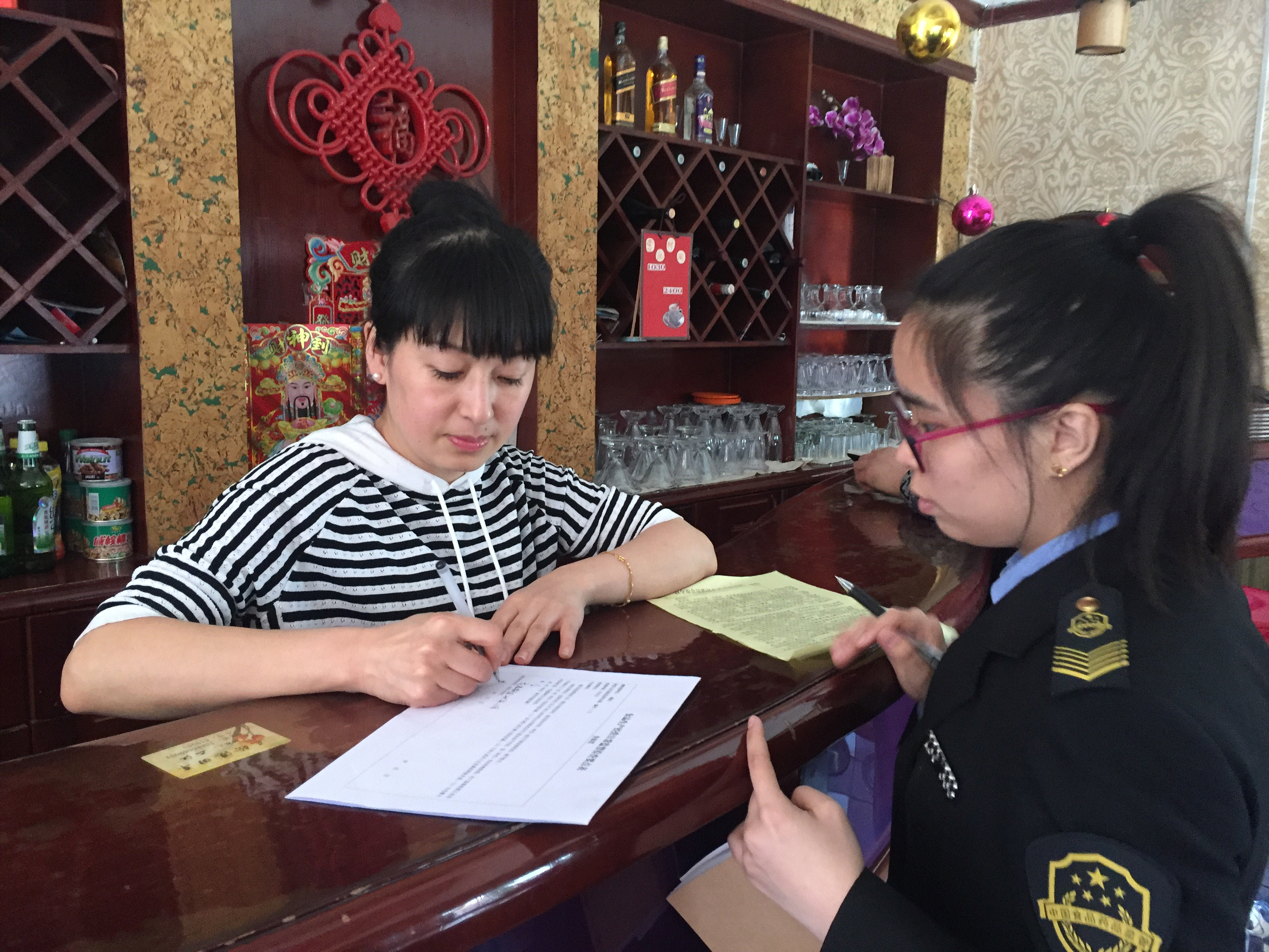 三是督促经营单位证照上墙。针对辖区部分经营单位未按规定悬挂许可的行为,执法人员及时指出问题,督促经营单位立即依法悬挂相关证照,并指导经营单位张贴《五病调离制度》、创文宣传画、食品经营相关制度等。