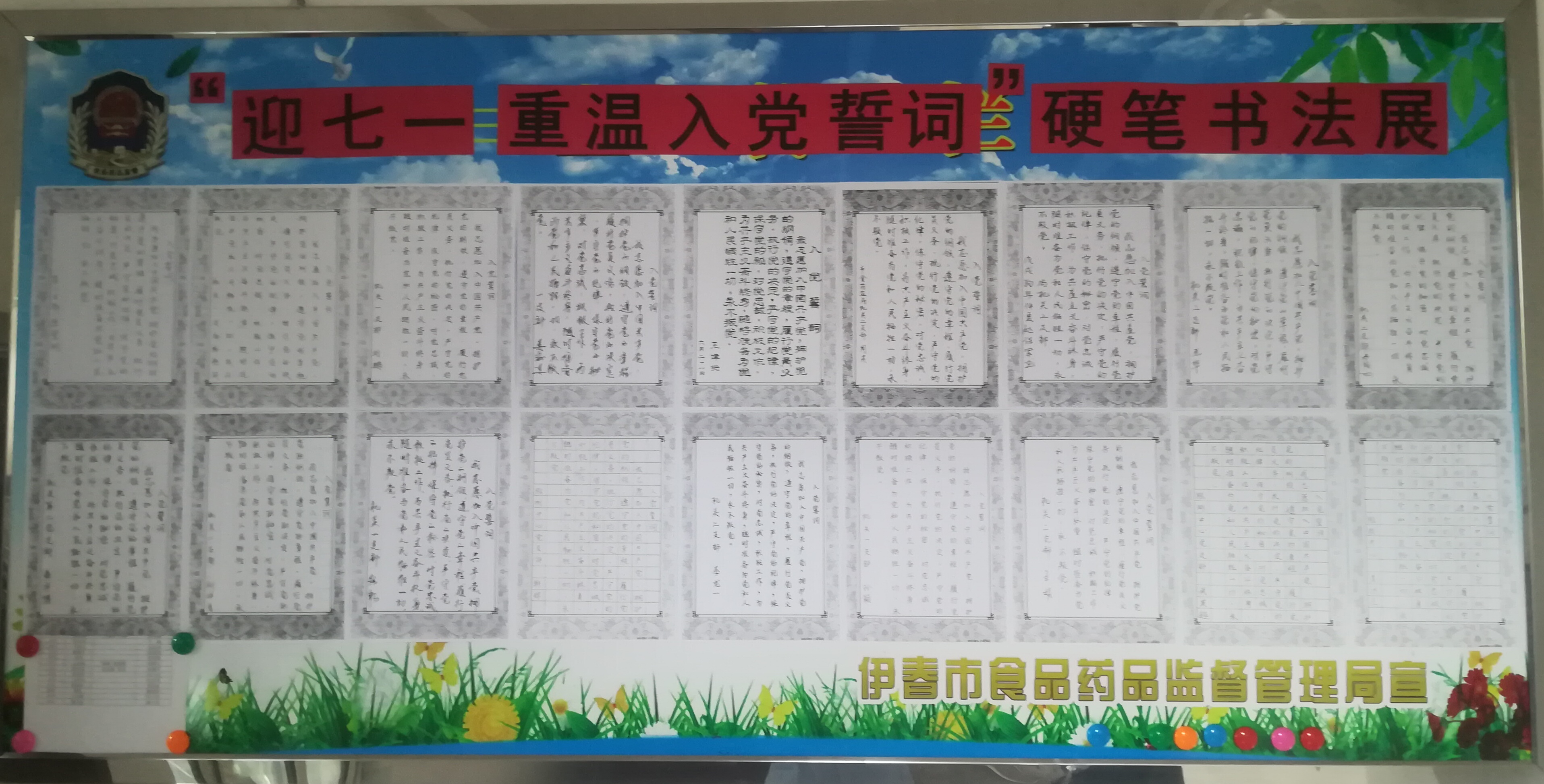 在庆祝中国共产党诞辰97周年之际,为营造尊崇党章的氛围,增强党员的党性观念,进一步坚定理想信念,牢记党的宗旨,伊春市食品药品监督管理局在全体党员和积极分子中开展了“迎七一·重温入党誓词”硬笔书法展活动。